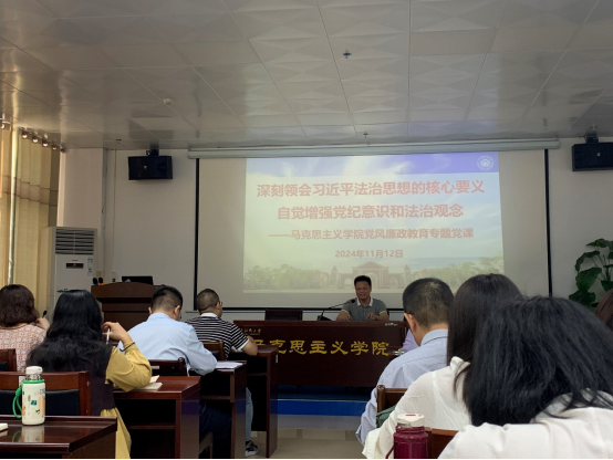 课上,官秀成书记以“深刻领会习近平法治思想的核心要义,自觉增强党纪意识和法治观念”为主题,结合党的二十届三中全会报告,阐述了习近平法治思想的重要地位和作用。他指出,习近平法治思想是习近平新时代中国特色社会主义思想的重要组成部分,体现了习近平总书记对全面依法治国的深入思考和战略谋划,深刻回答了新时代为什么实行全面依法治国、怎样实行全面依法治国等一系列根本性问题,是新时代全面依法治国的根本遵循和行动指南。官书记从“中国特色社会主义法治的本质属性”、“法治建设的重点任务和实现路径 ”、“法治建设的组织保障”等三方面深入分析了习近平法治思想的核心要义,使广大教师党员对新时代中国特色社会主义法治的理论依据、本质特征、指导思想、内在要求、发展方向有了进一步的认识和理解。