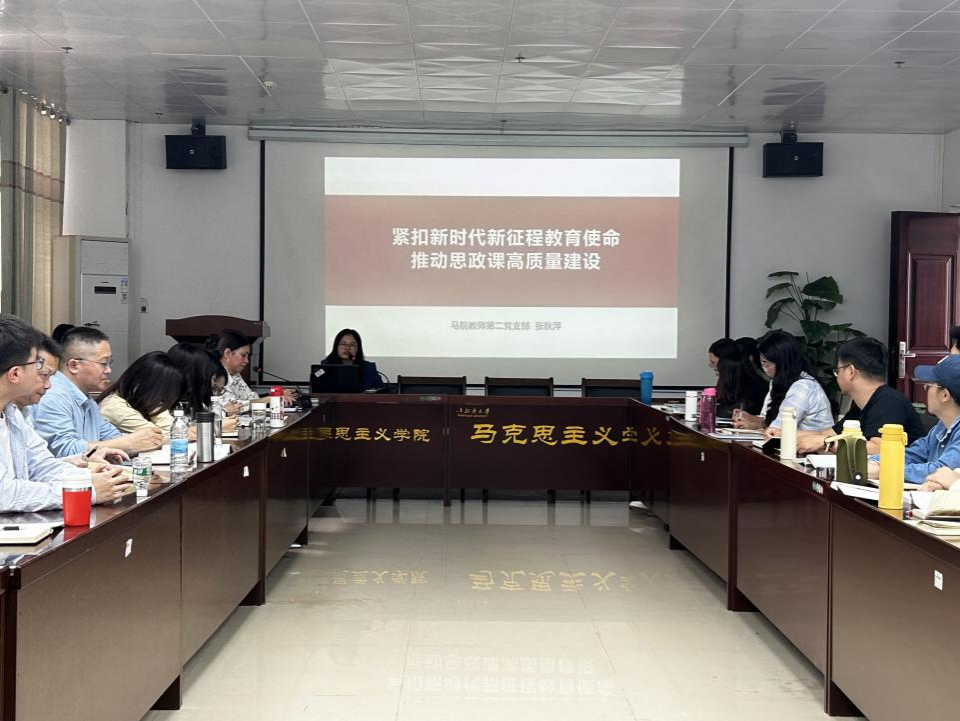为深入学习贯彻习近平总书记关于教育和思政课建设的重要论述,强化支部党员政治素养与育人担当,3月24日下午,马克思主义学院教师第二党支部在学院201会议室开展“紧扣新时代新征程教育使命 推动思政课高质量建设”专题党课活动。本次党课由党支部书记张秋萍主讲,全体党员参加学习。