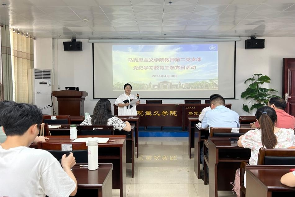 4月30日下午,马克思主义学院教师第二党支部在学院201会议室开展党纪学习教育主题党日活动,集中学习《中国共产党纪律处分条例》(以下简称“《条例》”)第一、二、三章。活动由支部书记张秋萍同志主持,全体党员同志参加会议。
