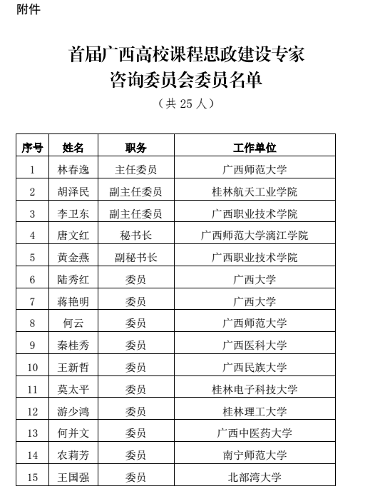 首届广西高校课程思政建设专家咨询委员会委员名单截图
