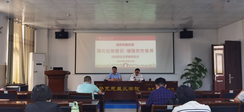 为不断增强党员教师队伍的纪律意识和廉政风险意识,全面贯彻落实党要管党、从严治党的主体责任,2022年10月18日,马克思主义学院组织开展了党风廉政建设专题党课,学院党总支书记、院长官秀成在会上为全体党员教师作了题为《强化纪律意识 增强党性修养》的专题讲座。