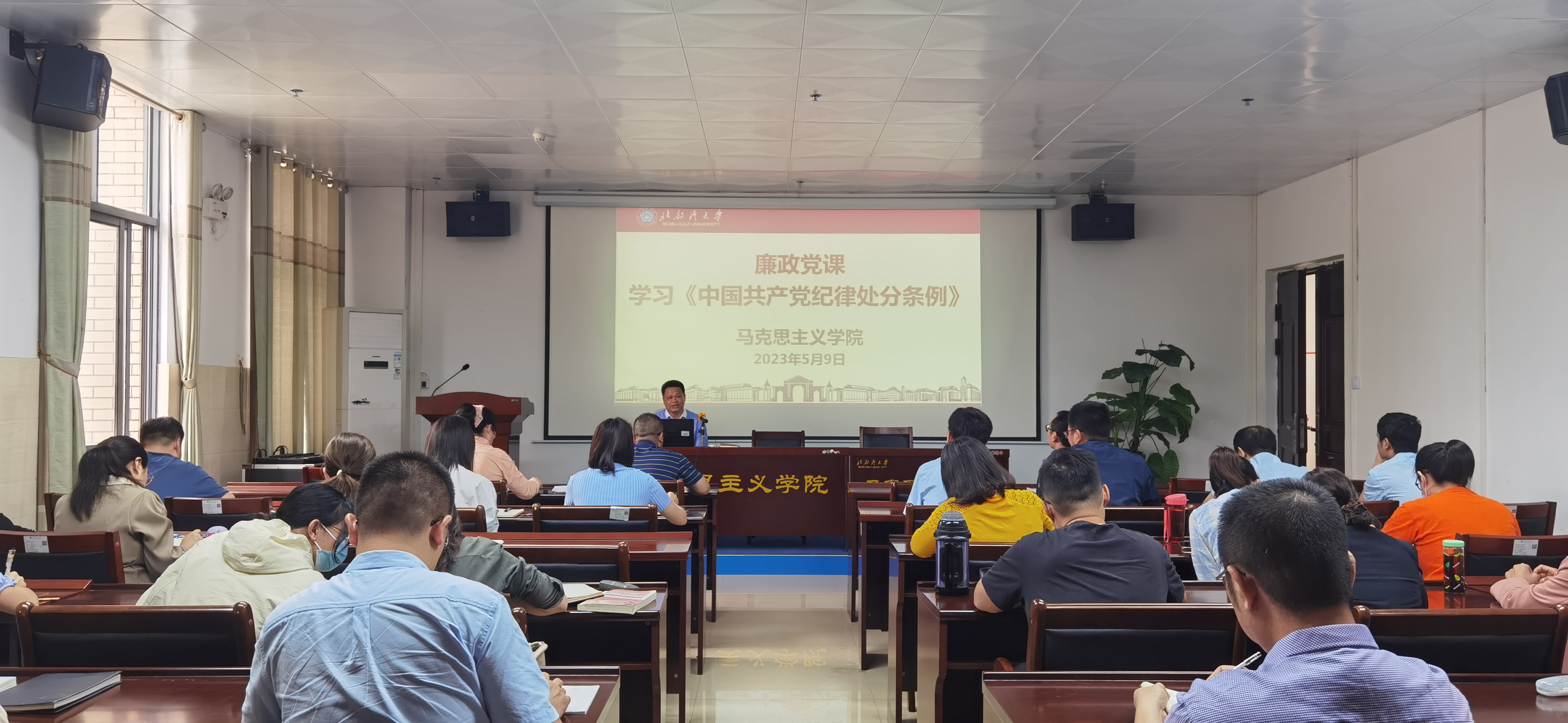 为推进学习贯彻习近平新时代中国特色社会主义思想主题教育,加强党风廉政建设,2023年5月9日下午,马克思主义学院开展廉政教育专题党课活动。学院党总支书记、院长官秀成以“学习《中国共产党纪律处分条例》”为题,重温党纪党规,在学院201会议室为马克思主义学院全体党员教师讲党课。