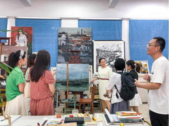 在陶瓷与设计学院海洋绘画工作室,教师们与师生探讨海洋艺术中的思政表达