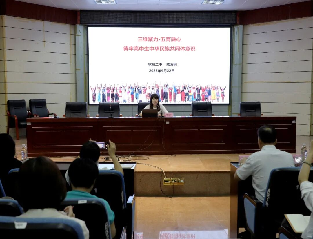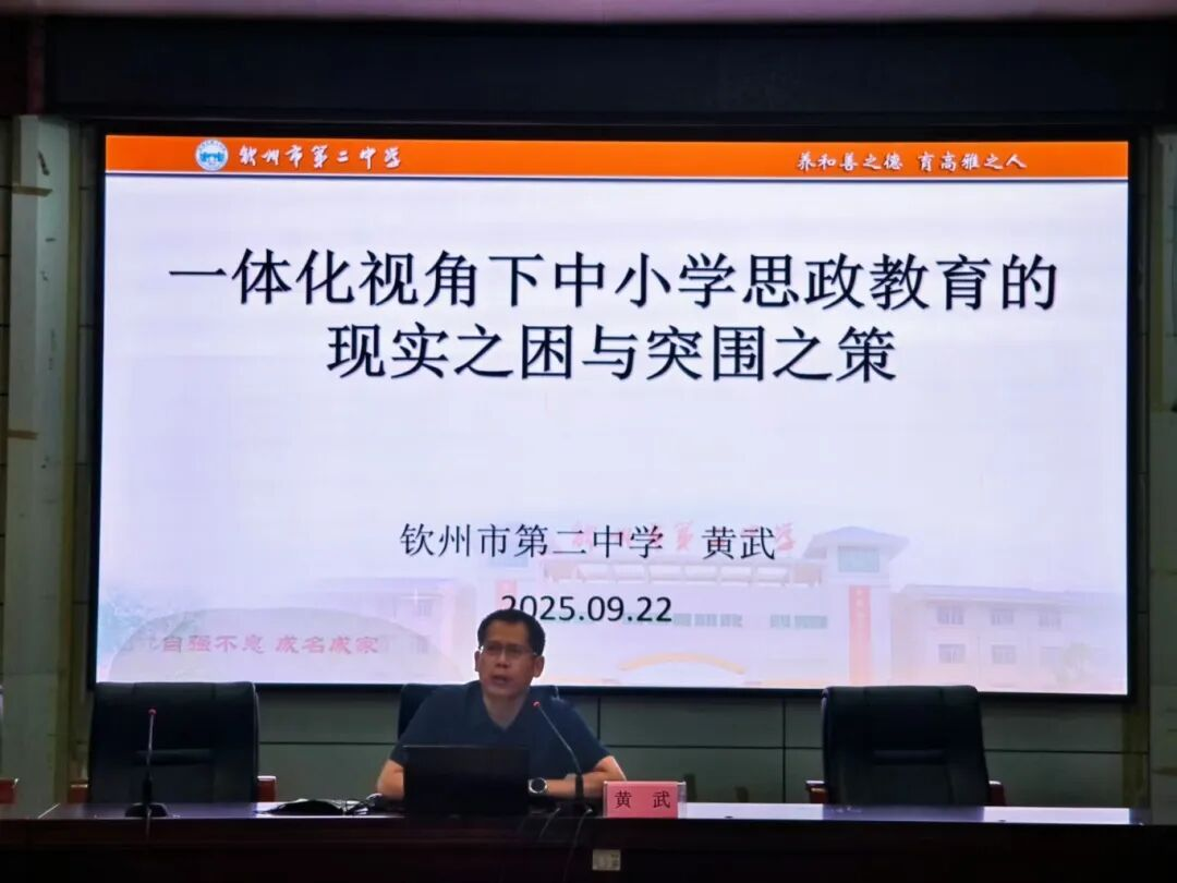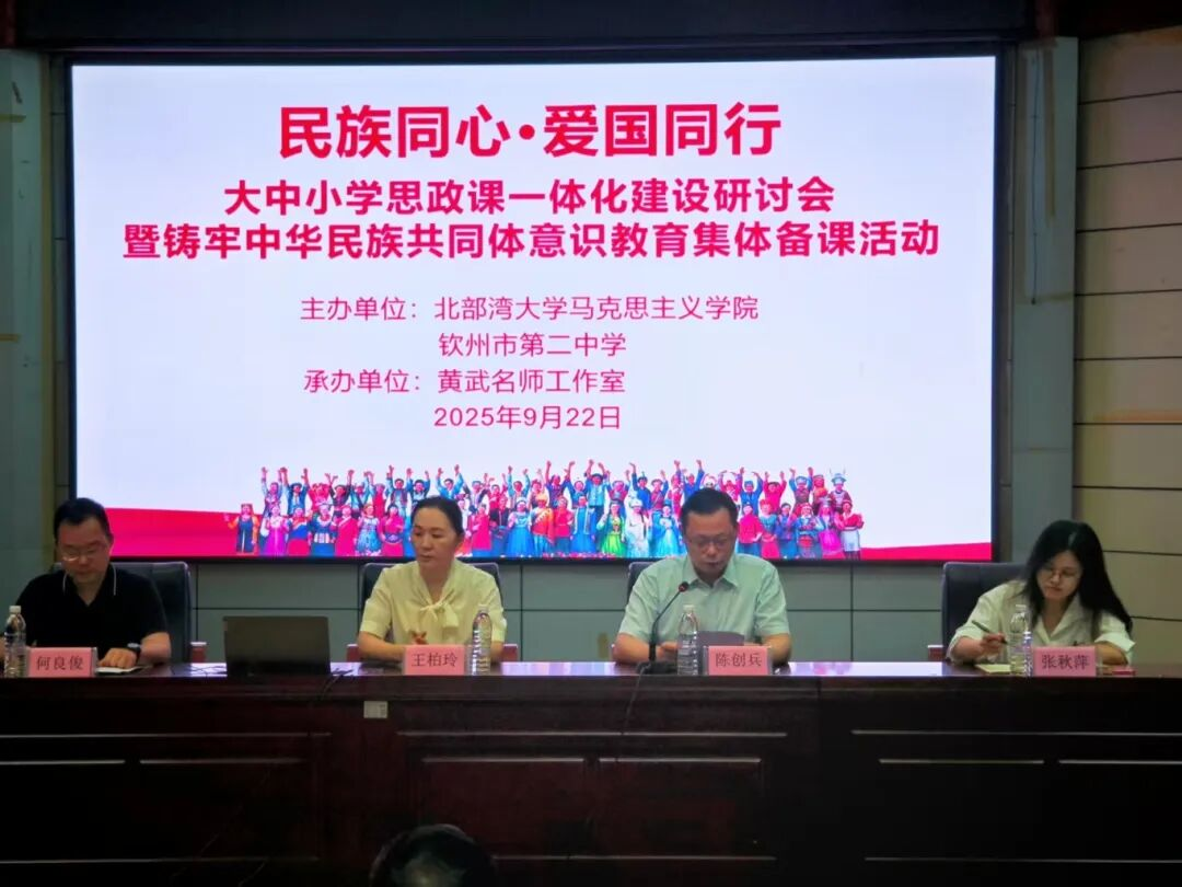 校地协同谱新篇,思政育人启新程,为深入贯彻落实习近平总书记关于"大思政课"建设的重要指示精神,扎实推进《关于深化新时代学校思想政治理论课改革创新的若干意见》落地见效,9月22日上午,北部湾大学马克思主义学院与钦州市第二中学联合举办"民族同心・爱国同行"钦州市大中小学思政课一体化建设研讨会暨铸牢中华民族共同体意识教育集体备课活动,同步启动2024级学科教学(思政)专业硕士生教育实习工作。活动由黄武名师工作室承办。北部湾大学马克思主义学院院长王柏玲、钦州市第二中学校长陈创兵、北部湾大学马克思主义学院师生代表、市中小学思政课教师代表以及黄武名师工作室成员等100多人参加活动。