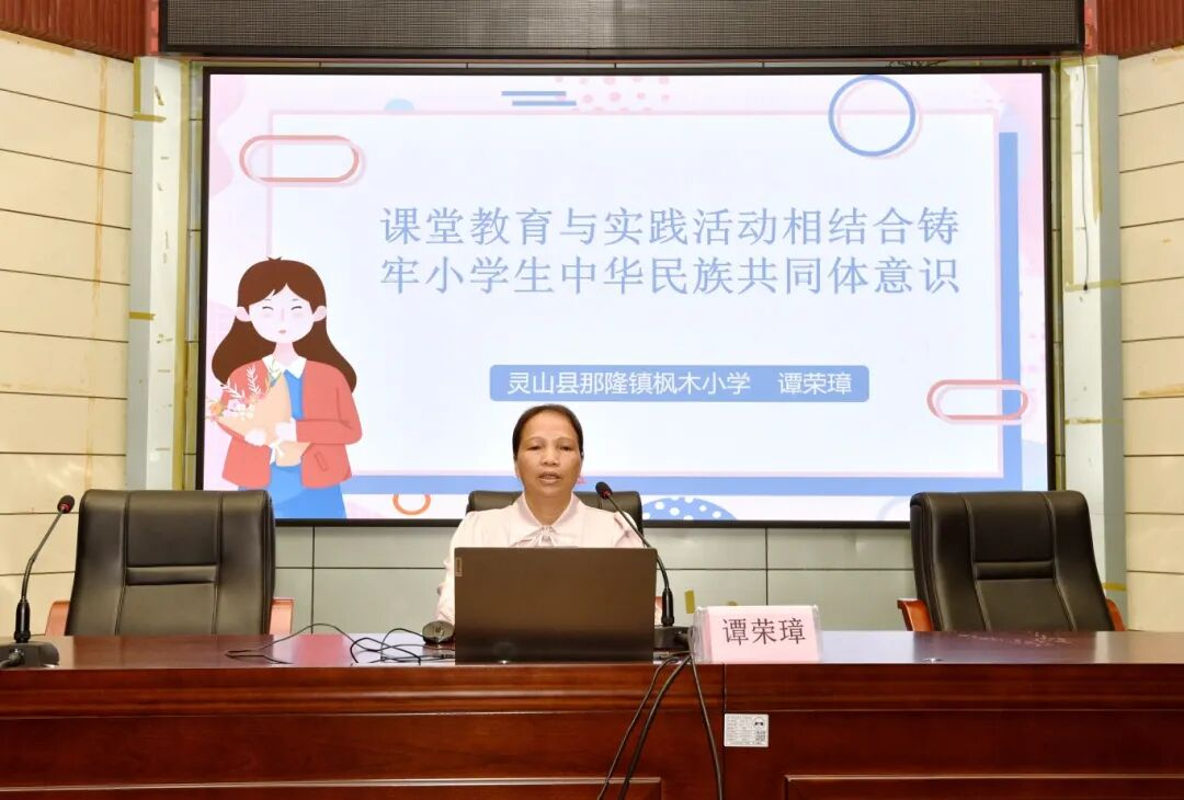 在教学经验分享环节,各学段教师代表围绕铸牢中华民族共同体意识教育主题展开深入交流。灵山县那隆镇枫木小学校长、正高级教师谭荣璋提出"理论认知+情感体验+文化浸润"的"三维联动"教学策略,通过"祖国山河拼图""烟墩大鼓进校园"等活动,让小学生在具象体验中铸牢中华民族共同体意识。钦南区教研室正高级教师苏联盛分享"三主四动"课堂模式,阐释如何构建高效思政课堂。钦州二中高级教师陆海娟针对高中生思维特点,提出"课程整合、教学创新、实践拓展"三维聚力方法。