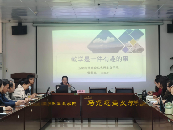 玉林师范学院马克思主义学院原理教研室主任、国家级一流本科课程负责人黄基凤教授以“教学是一件有趣的事”为主题,从“坚信教学的重要性与必要性”“一流本科课程建设路径”“优质课堂打造方法”三个维度,分享了国家级一流本科课程建设与课堂教学的宝贵经验,强调思政课教师要以热爱为底色,让课堂充满温度与活力。