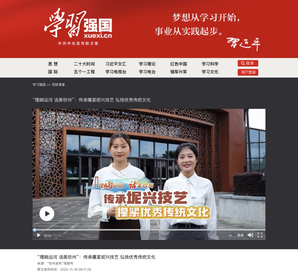 “学习强国”平台发布的“理响运河·话美钦州”微宣讲视频主页截图