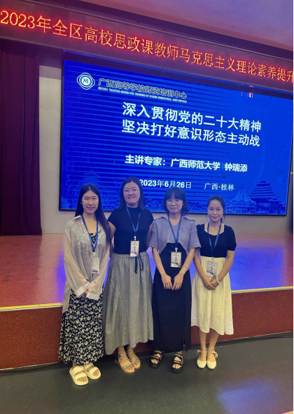 2023年6月26日至6月30日,由自治区党委教育工委、自治区教育厅主办,广西师范大学承办,广西高等学校师资培训中心协办的“全区高校思政课教师马克思主义理论素养提升专题备课会”在桂林举行。我院教师乔艳艳、闭晓静、赵淇、韩海冬参加了此次会议。