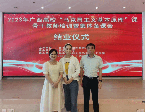 广西自治区教育厅举办的2023年全区高校“马克思主义基本原理”课骨干教师培训暨集体备课会于2023年9月15日在广西桂林举行,培训会为期5天。原理教研室张水莲、张椿微、唐天勇三位教师参加了本次培训会。